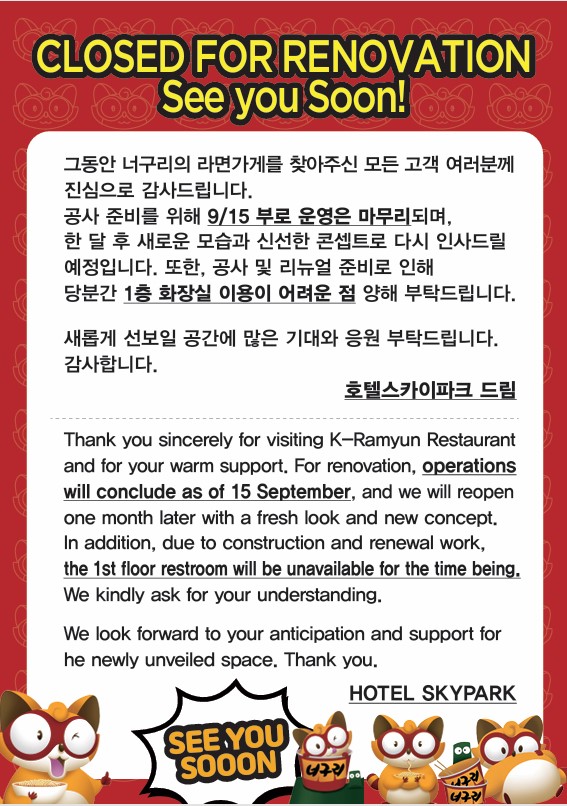 안녕하세요, 호텔 스카이파크 S CLUB 입니다. 그동안 호텔 스카이파크 명동 3호점 너구리의 라면가게를 찾아주신 모든 고객 여러분께 진심으로 감사드립니다.